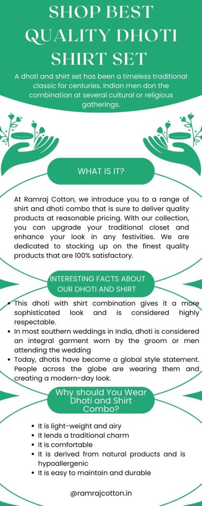 It is easy to maintain and durableAre you hunting for a dhoti shirt set combo online? Do you wish to purchase one at affordable prices? Well, Ramraj Cotton is glad to help. Our dhoti and shirt set price are extremely reasonable so that you can afford us for your upcoming festivities.